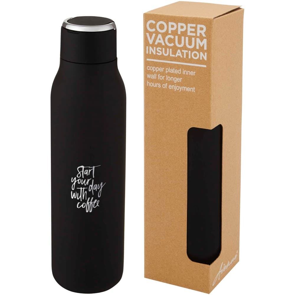 De fles van Marka heeft een roestvrijstalen vacuümconstructie met koperen isolatie die dranken enkele uren warm of koud houdt. De geïsoleerde 18/8 roestvrijstalen constructie voorkomt condensatie aan de buitenkant van de fles en de trendy poederlakafwerking maakt de fles extra duurzaam. Hij heeft ook een morsbestendig schroefdeksel en een duurzame handlus van zinklegering. BPA-vrij, getest en goedgekeurd volgens de Duitse voedselveiligheidswetgeving (LFGB). Getest en goedgekeurd voor ftalaten volgens de REACH-regelgeving. Past in de meeste standaard autobekerhouders. De inhoud is 600 ml. Handwas aanbevolen. Geleverd in een gerecycled kartonnen geschenkverpakking.