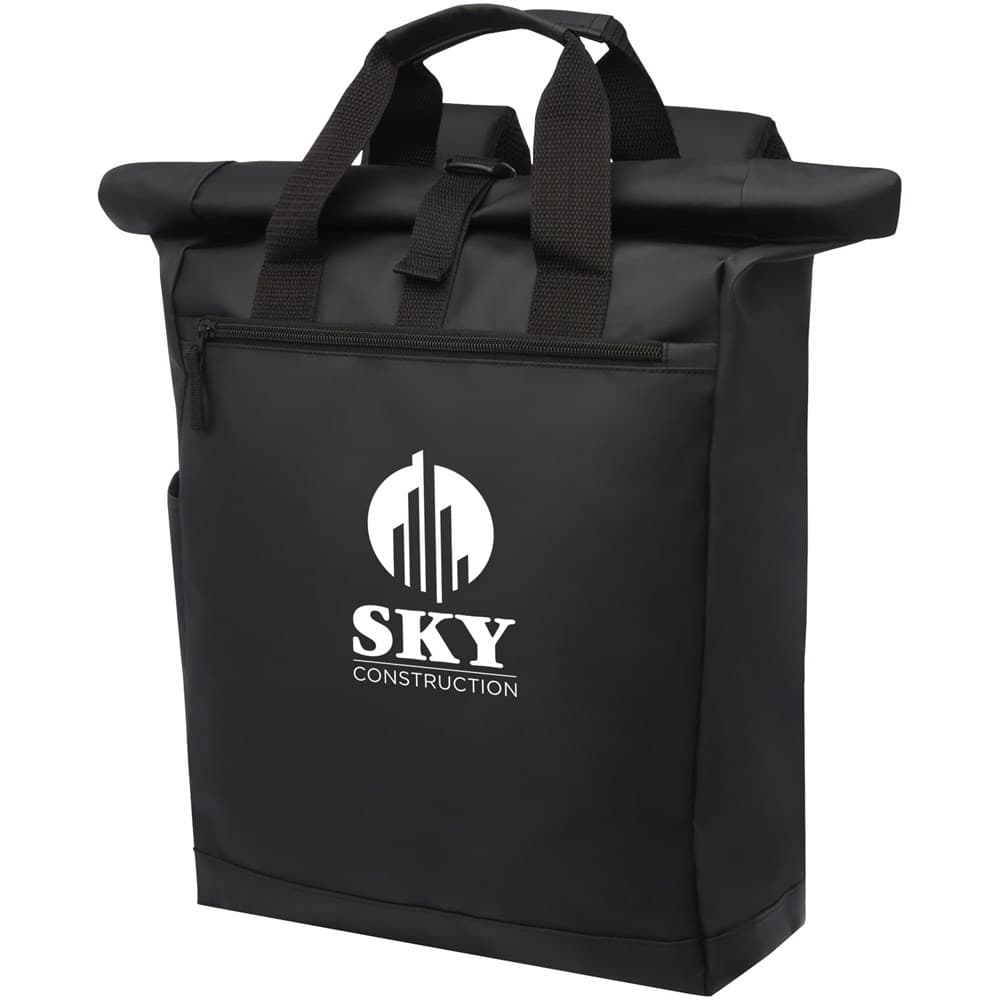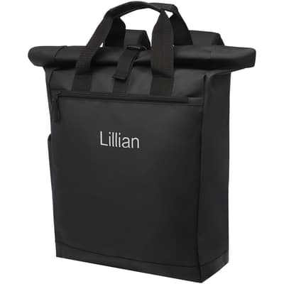 Waterbestendige rugzak met gewatteerd laptopvak, gewatteerde verstelbare schouderbanden, hoofdvak met ritssluiting, rolsluiting en 2 handgrepen.