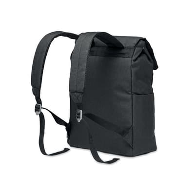 600D duotone RPET laptop rugzak met magnetische drukknoopsluiting. Gevoerd laptopvak voor 15 inch laptops, voorvakken met rits en 2 zijvakken.