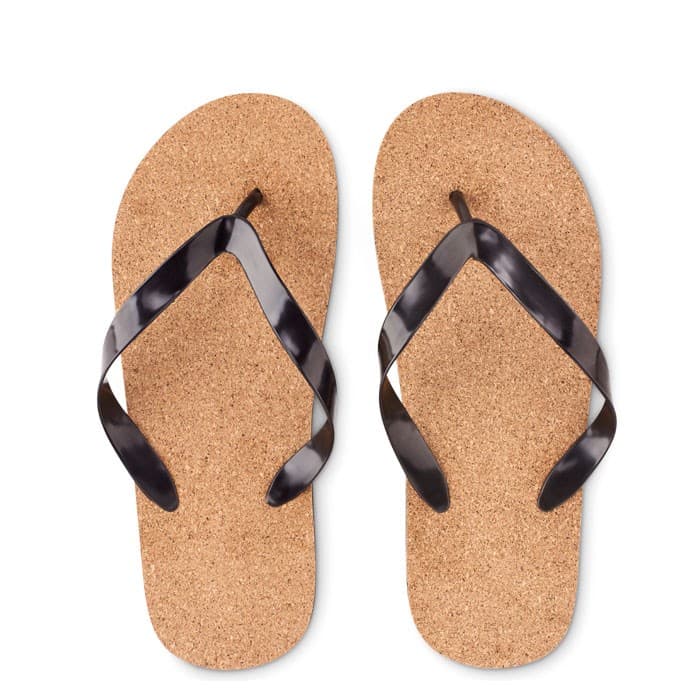 Badslippers met EVA zool en kurk toplaag en PVC bandjes. Maat M past 36-39. Kurk is een natuurlijk materiaal. Door de structurele aard en de porositeit van het materiaal kan het uiteindelijke drukresultaat per item afwijkingen vertonen. Ideaal voor slippers bedrukken.