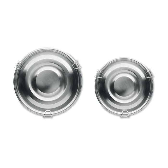 Roestvrijstalen lunchbox of opbergset met sterke en veilige gespen aan de zijkant. Inhoud: 450 ml. en 900 ml.