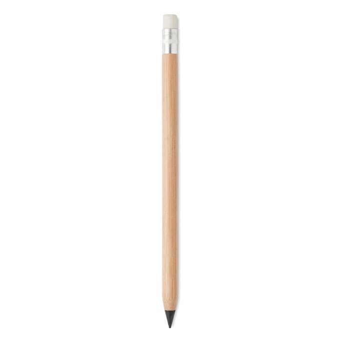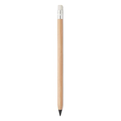 Duurzame bamboe inktloze pen met dop van karton. De pen schrijft door middel van een punt van een metaallegering. Bamboe is een natuurlijk product, de kleur per artikel kan verschillen.