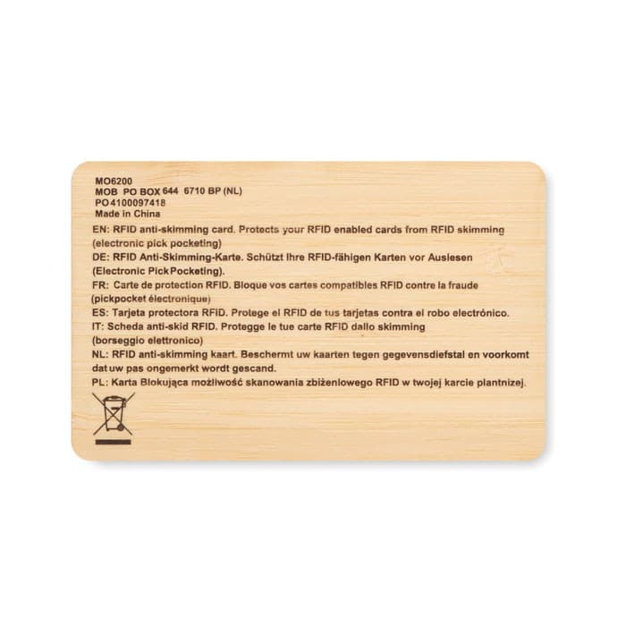 Bamboe RFID houder voor pasjes. Door het elektromagnetische veld worden alle 13.56 MHz passen (OV-, bank- of creditcards) veiliggesteld tegen skimming. Bamboe is een natuurlijk product, de kleur per artikel kan verschillen.