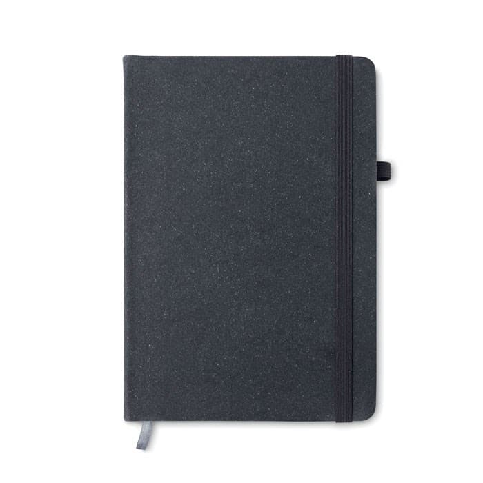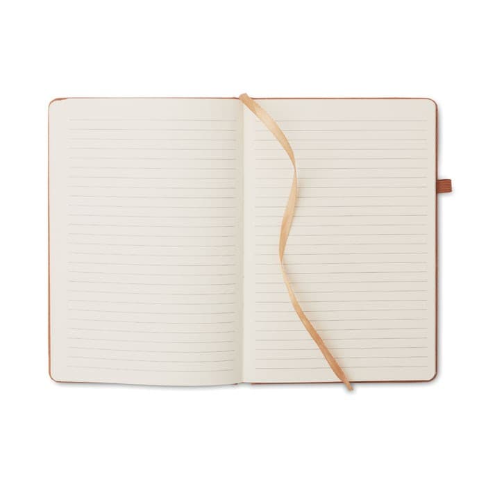 A5 notitieboek met 70% gerecycled leer en 30% PU latex kaft. Gebonden in etui. 160 gelinieerde pagina's gerecycled papier (80 vellen). Bijpassende elastische sluitingsband en penhouder.