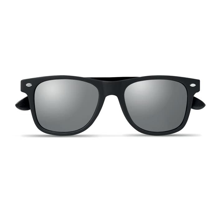 Zonnebril met zwart gecoate bamboe pootjes en spiegelglazen. UV400 bescherming. Bamboe is een natuurlijk product, de kleur per artikel kan verschillen.