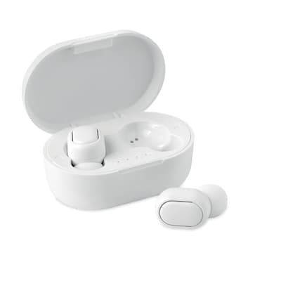 Gerecycled ABS True Wireless Stereo (TWS) 5.0 draadloze stereo oordopjes met microfoon en ingebouwde 40 mAh batterij. Speeltijd ca. 4 uur. Automatisch koppelen. Inclusief een micro USB oplaadkabel en een 300 mAh laadstation.