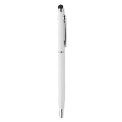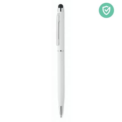 Aluminium stylus balpen met draaimechanisme en glanzende clip en antibacteriële houder. ISO 22196. Blauwe inkt.