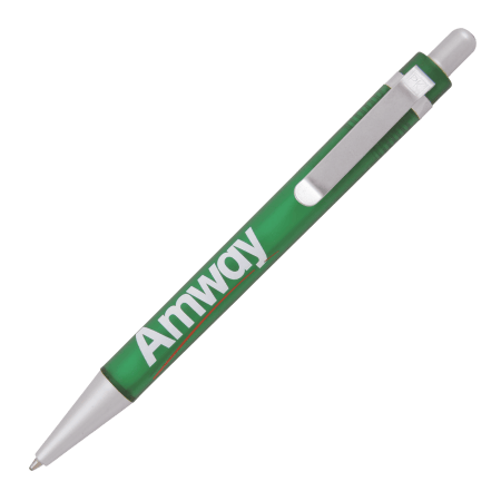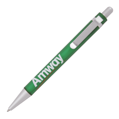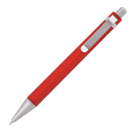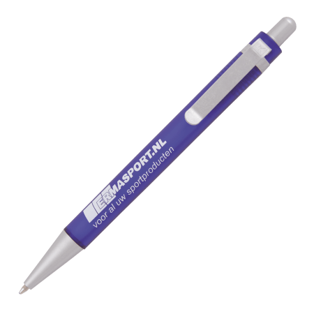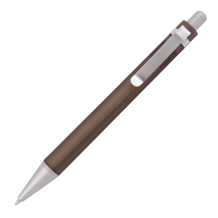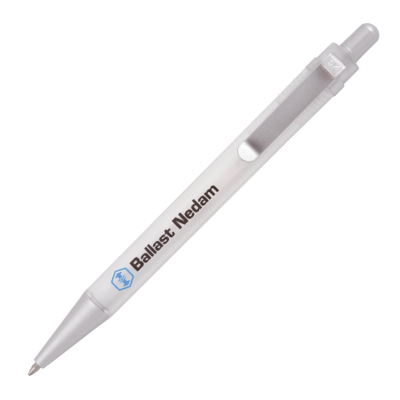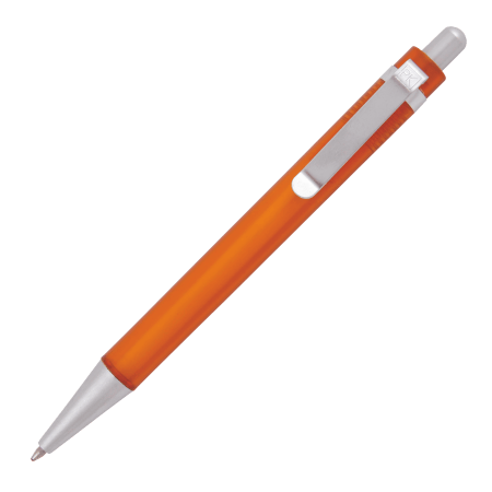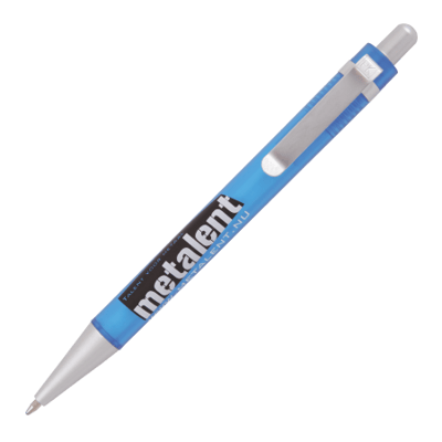 ARTICA kunststof balpen Peekay. Kunststof houder in actuele frosty kleuren, mat-verchroomde metalen clip en aluminium-kleurige kunststof drukker en puntstuk. Voorzien van blauwschrijvende plastic langschrijfvulling.