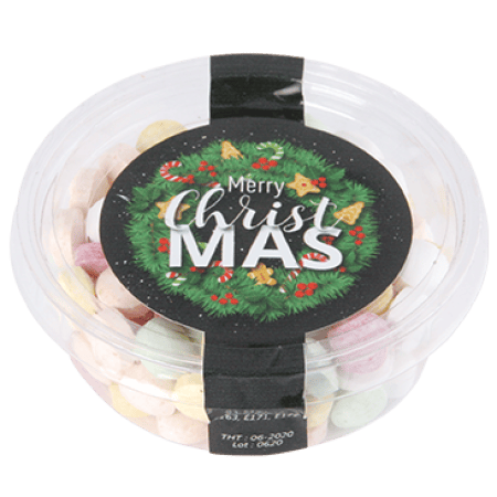 Transparant Biodegradable bakje met los deksel 70 mm Ø x 26 mm, gevuld met 40 gr. mintjes, fruit bolletjes of fruit hartjes