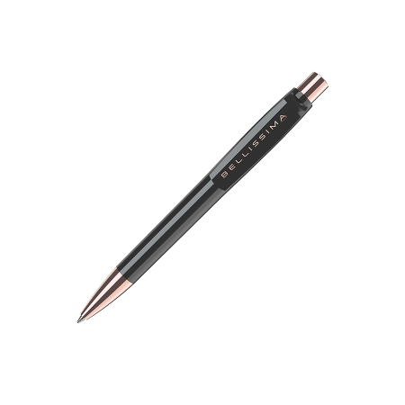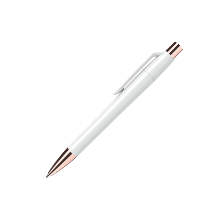 Maxema balpen MOOD MD1 C M3 met glanzende gekleurde houder en clip, rosé goudkleurig metalen puntstuk en drukker. Voorzien van Parker vulling met blauwe Dokumental inkt voor tot 4.000 meter schrijfplezier. Houders en clips leverbaar in 2 kleuren die per onderdeel vanaf 2.000 onderling te combineren zijn