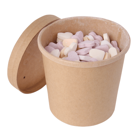 Snoeppot van natuurlijk ongebleekt kraft karton met deksel, 360 ml, gevuld met ca. 260 gr. DutchDex hartjes met natuurlijke smaak- en kleurstoffen