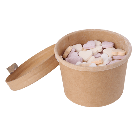 Snoeppot van natuurlijk ongebleekt kraft karton met deksel 240 ml, gevuld met ca. 175 gr. DutchDex hartjes met natuurlijke smaak- en kleurstoffen