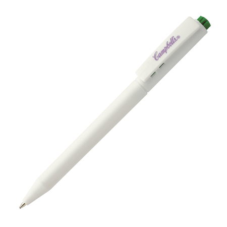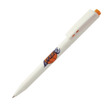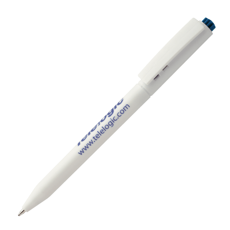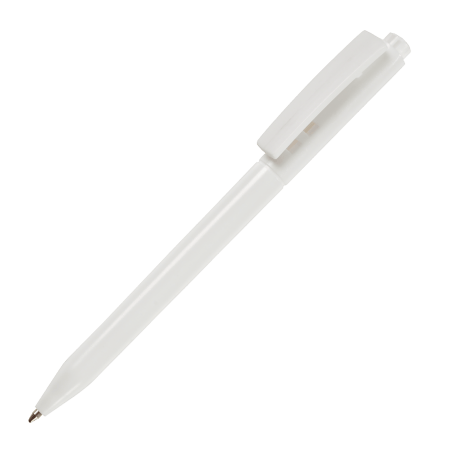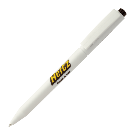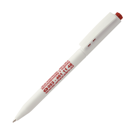 HALLIGEN kunststof balpen HC Peekay. Witte balpen met houder en clip uit 1 stuk, uniek clip-druk mechaniek, gekleurde drukkers en blauwschrijvende plastic X-20 vulling