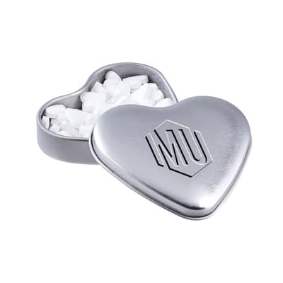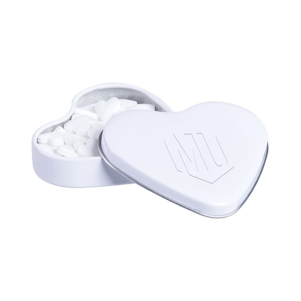 Hartenblikje wit met met ca. 23 gram hartjes pepermunt en voorzien van embossing. Inclusief ingrediëntensticker en seal (eenmalige malkosten 395,-)