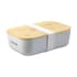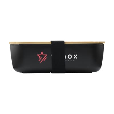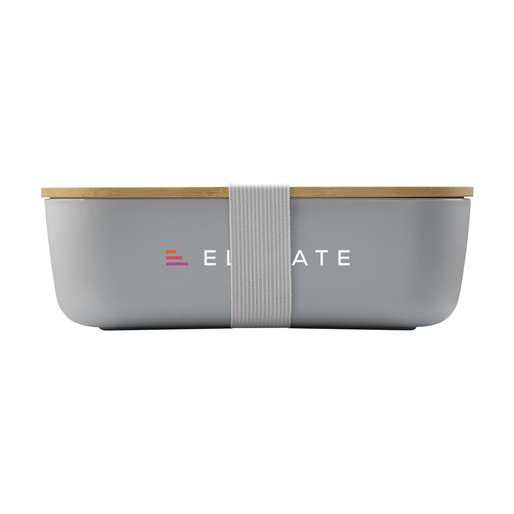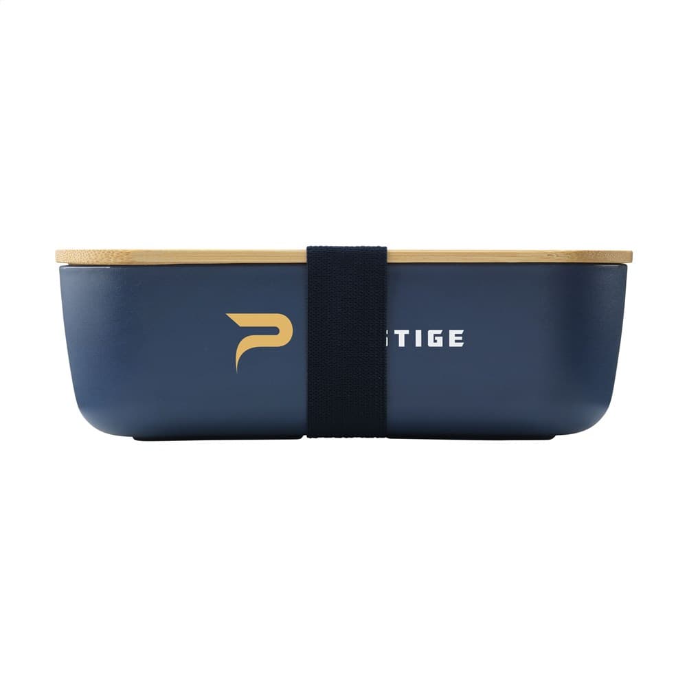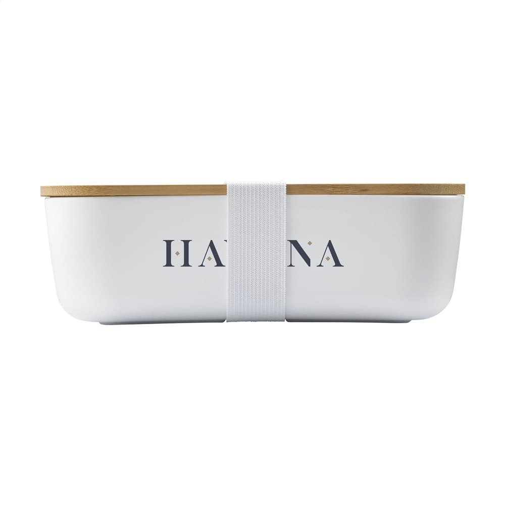 Royale lunchbox van PP kunststof. Het deksel is van natuurlijk bamboe. Inclusief elastische sluitband, ideaal voor je broodtrommel bedrukken.