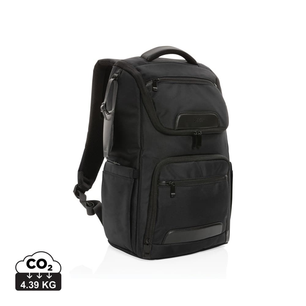 Maak het dagelijkse reizen een beetje makkelijker en een stuk stijlvoller met deze laptoprugzak. De tas is gemaakt van duurzaam 1680D gerecycled polyester met rijke PU-details en heeft een goed ontworpen vorm met meerdere vakken voor opslag en organisatie. Naast het ruime hoofdcompartiment heeft de rugzak een gewatteerd 15,6" laptopvak en een extra ritsvak om je andere dagelijkse benodigdheden in op te bergen. Andere kenmerken van deze rugzak zijn een USB-uitgang, RFID-vakken, pennenlussen, een afneembaar bagagelabel en een zijvak voor een waterfles. Buitenkant: 100% 1680D polyester / Voering: 150D gerecycled polyester. Met AWARE™ tracer die het echte gebruik van gerecyclede materialen valideert. Elke tas bespaart 29,8 liter water en heeft 49,92 0,5L PET-flessen hergebruikt. 2% van de opbrengst van elk verkocht product dat AWARE™ bevat, wordt gedoneerd aan Water.org.