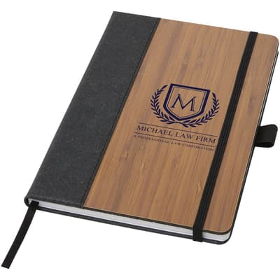 A5 notitieboek met bamboe omslag en rug van gebonden leer. Bevat 80 vellen, 80 g/m2 gelinieerd gerecycled papier en een zwarte penlus, elastische band en een lintmarker.