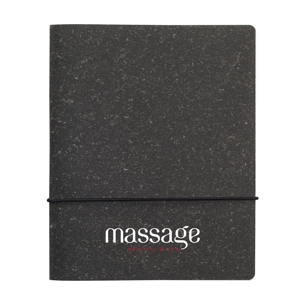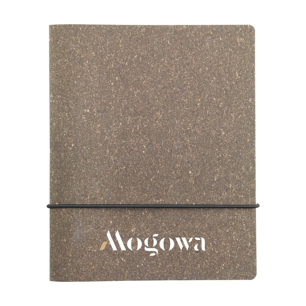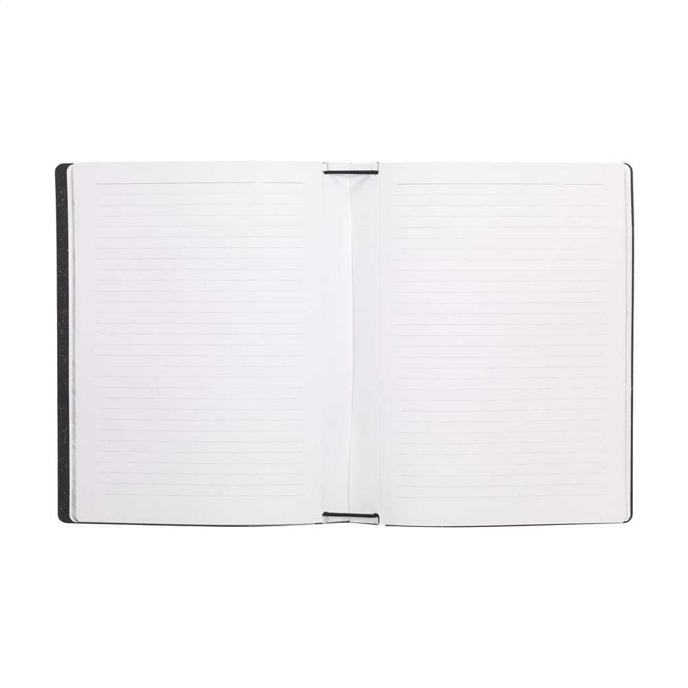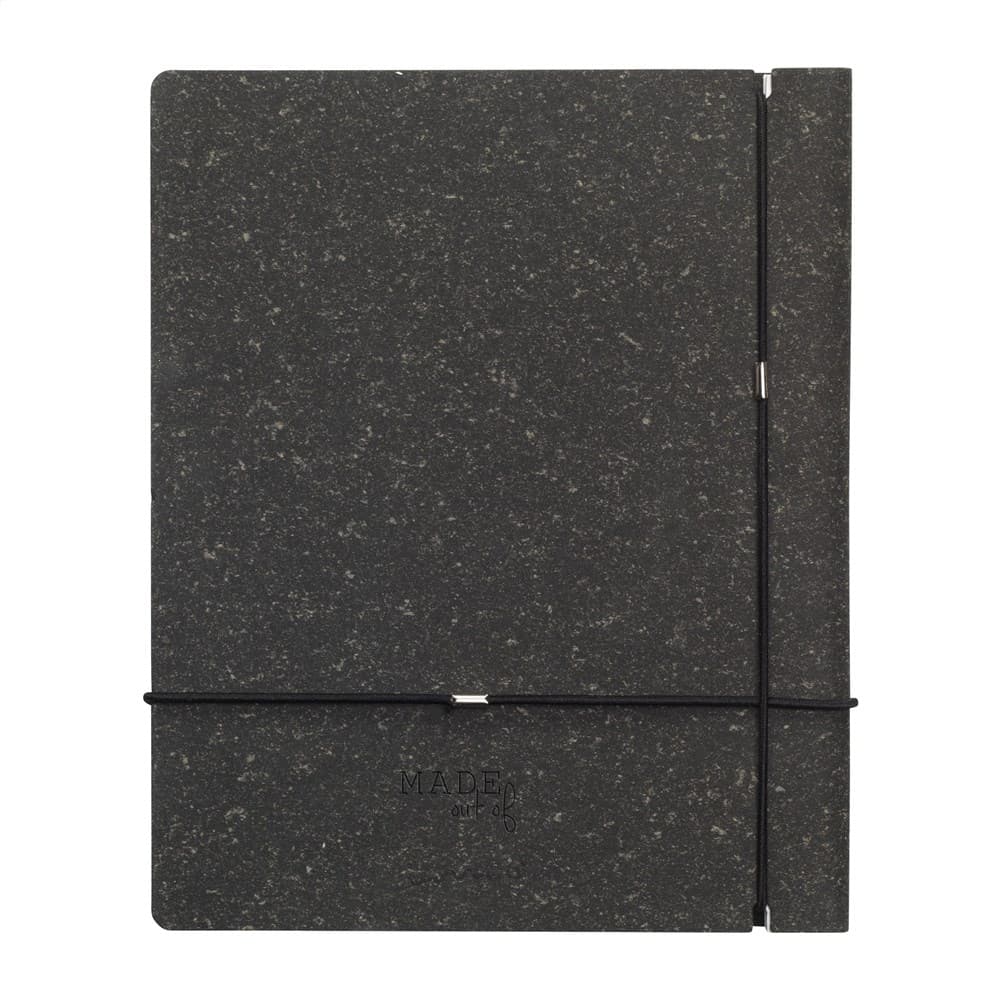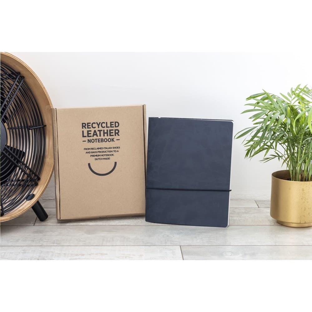 A5-notitieboekje met een omslag gemaakt van gerecycled leerafval (van leer afkomstig uit Italië) en natuurlijke binders. Een product van het merk Made out of. Het gerecycled leer is zeer stevig, heeft een mooie matte uitstraling en ruikt naar leer. De gekleurde toplaag is gemaakt van een zeer dunne PU-coating op 100% waterbasis. Dit notitieboekje met sluitelastiek, heeft een losse, uitneembare, hervulbare inhoud (Reuse & Reduce) bestaande uit ca. 120 vel/240 pagina's gelinieerd, gerecycled, FSC-gecertificeerd papier, dat CO2 neutraal geproduceerd is. De inhoud wordt op zijn plaats gehouden met een stevige elastiek. Handgemaakt. Dutch design. Made in Holland. Extra info inzake levertijd: 1 - 250 stuks: 2 weken, 250 - 1.000 stuks: 3 weken. Vanaf 1.000 stuks prijs en levertijd op aanvraag. Optioneel: Per stuk in kraft doos.