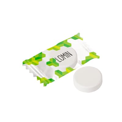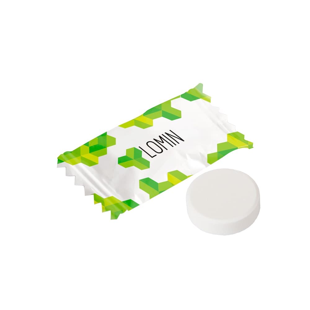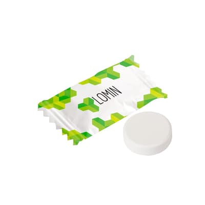 Flowpack met 1 pepermunt tablet in transparante folie, voorzien van een all-over full colour bedrukking