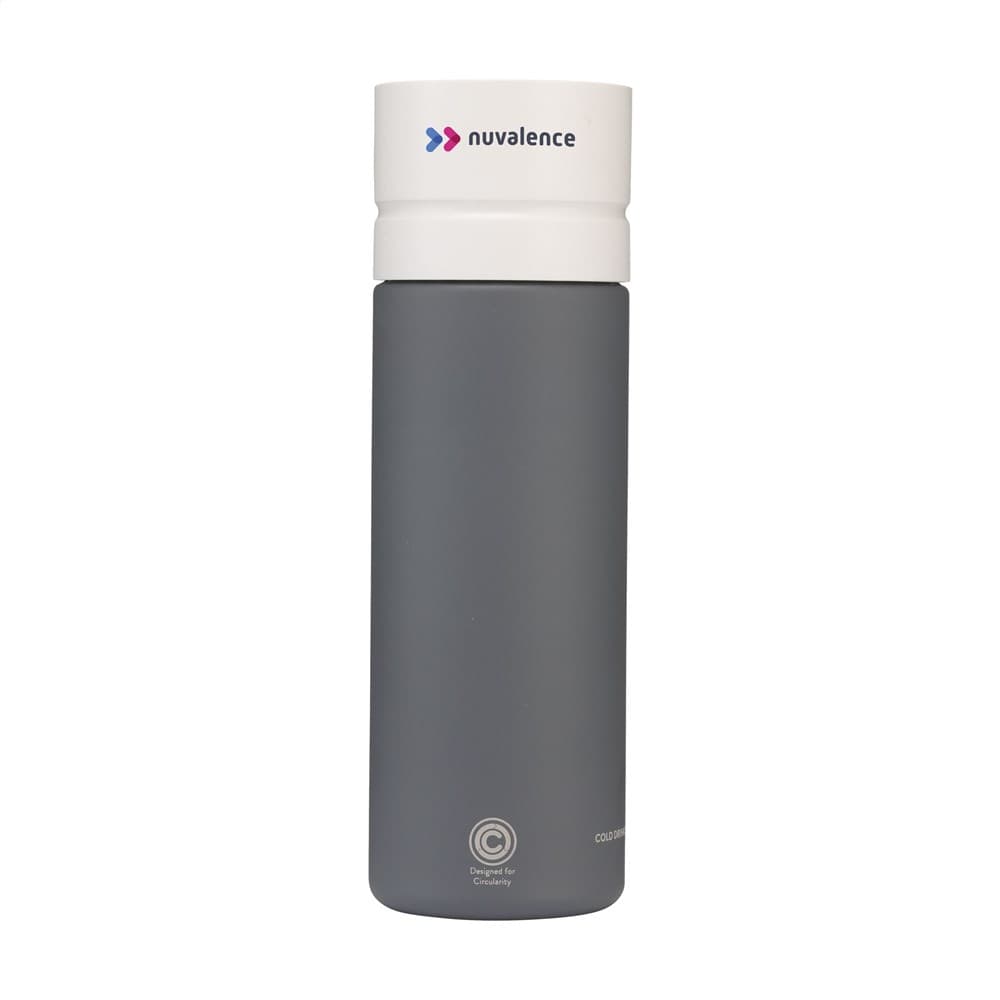 Duurzame, circulaire waterfles van Circular&Co. Deze fles is voor 92% gemaakt van 14 gebruikte en gerecyclede PET-flesjes. De schroefdop is ontworpen met een gepatenteerde 360-graden technologie, waarmee je vanuit elke hoek kunt drinken. Deze push-click-dop kun je met één hand en één klik openen en sluiten. Ideaal voor onderweg. De fles is superlicht in gewicht, 100% recyclebaar en 100% lekvrij. Geschikt voor koolzuurhoudende dranken, vul in dat geval de fles niet helemaal tot de rand. Niet geschikt voor warme dranken. Inhoud 600 ml. EXTRA INFO: Bij een minimale afname van 5.000 stuks is het deksel van dit product verkrijgbaar in elke PMS-kleur. Zo creëer je een perfecte match tussen product en opdruk.