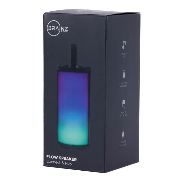 Deze hippe BRAINZ Flow Speaker heeft niet alleen een unieke uitstraling, maar ook een kwalitatief goed geluid. Er kunnen verschillende LED lichtstanden gekozen worden, waaronder één die reageert op de maat van de muziek. Hierdoor ben je direct in de juiste “FLOW”. De speaker heeft diverse ingangen, bijvoorbeeld voor een micro SD-kaart, AUX- en USB-kabel. Maak eenvoudig via Bluetooth verbinding. Het duurt ca. 3 uur voordat de speaker volledig is opgeladen en vervolgens kun je ook ca. 3 uur lang genieten van de lekkerste klanken.