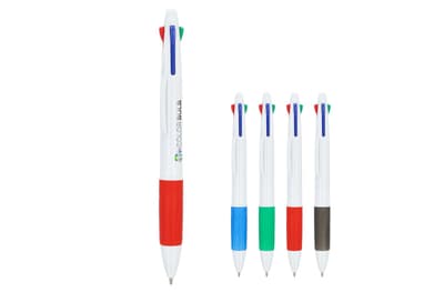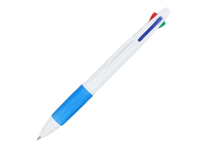 Klassieke vierkleurenbalpen met grip. De schrijfkleuren zijn blauw, zwart, rood en groen.