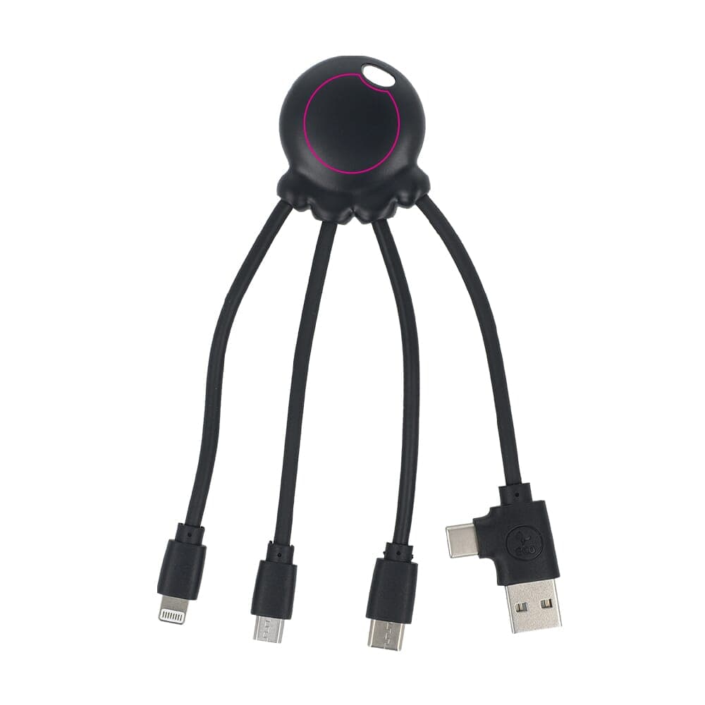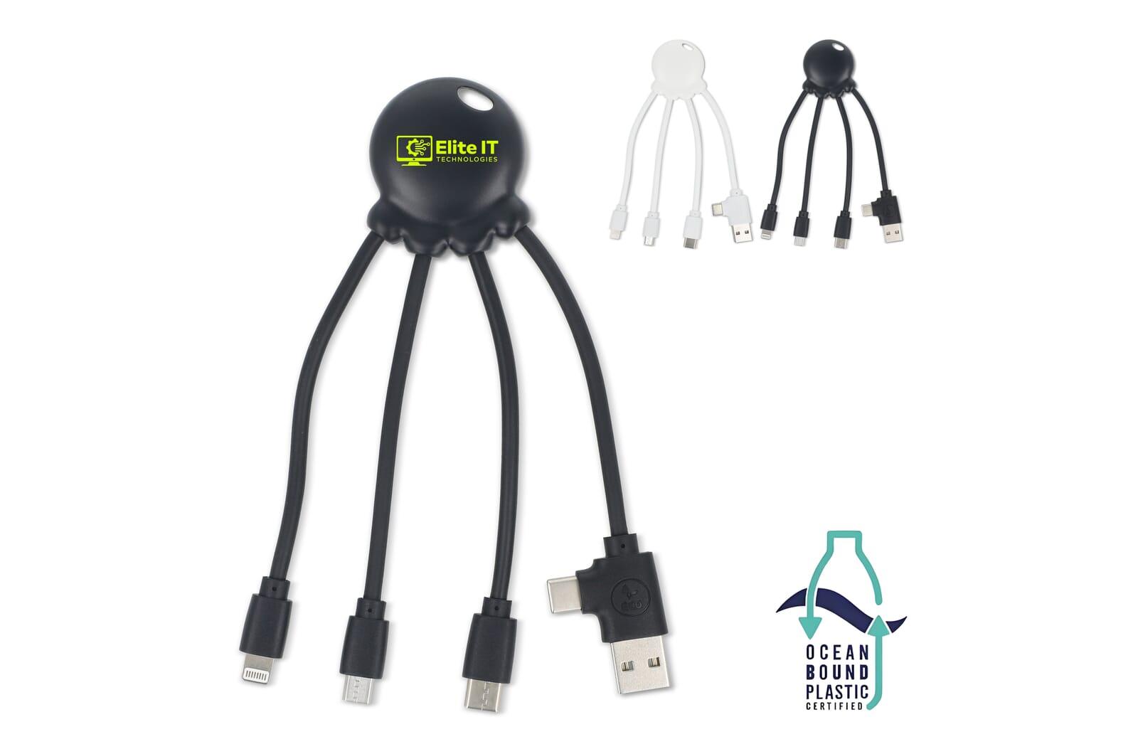 De Eco Octopus oplaadkabel is gemaakt van plastic dat afkomstig is uit de oceaan. Met twee ingangen (USB-A en USB-C) en drie verschillende aansluitingen kun je je apparaten op een milieuvriendelijke manier opladen. Op je bureau, in de auto, in je tas of op vakantie – deze multi-oplaadkabel komt altijd van pas!
