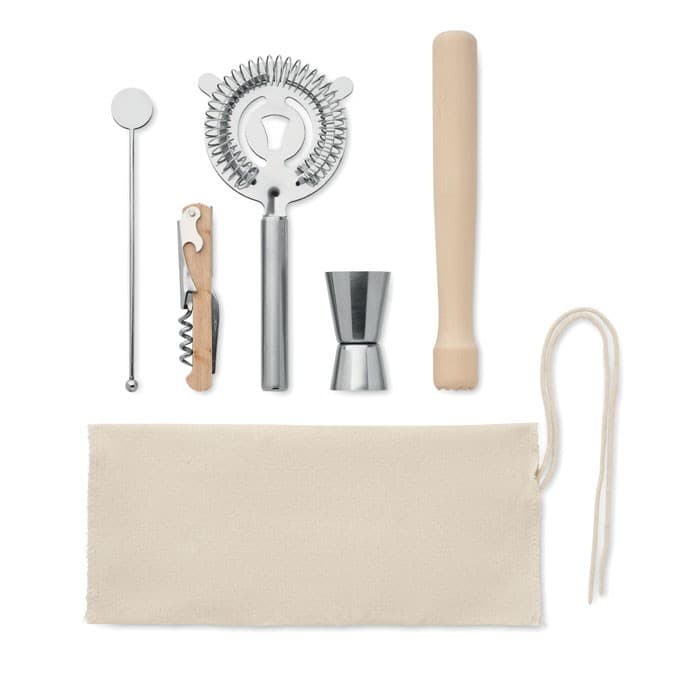 Wil je glazen bedrukken als onderdeel van een originele cocktailset? Deze cocktailset wordt geleverd in een katoenen opbergetui met koordsluiting en bevat vijf accessoires: een dubbelzijdige maatbeker (15 en 30 ml), houten prikker, cocktailzeef, roerstaaf en kurkentrekker. De pouch is gemaakt van stevig katoen van 220 gram per vierkante meter. Perfect om te combineren met je eigen bedrukte glazen voor een complete en persoonlijke presentatie.