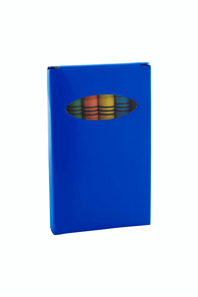 6 gekleurde krijtjes in gekleurde papieren doosje.