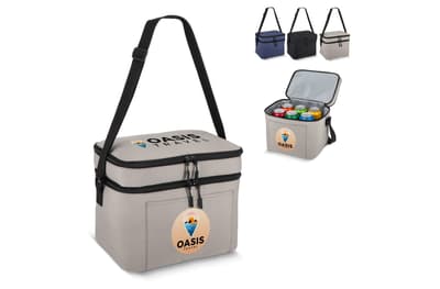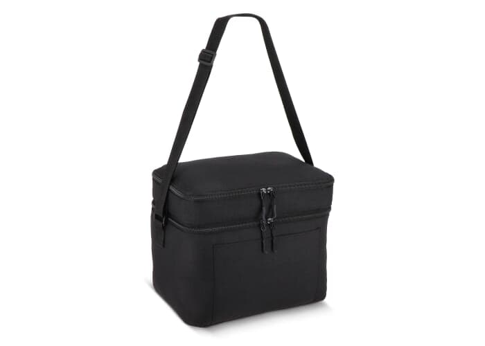 Koeltas van 600D gerecycled PET met een inhoud van 15L, voorzien van een groter ondervak en een kleiner bovenvak. Dankzij de isolerende PEVA-voering kun je warme en koude spullen gescheiden bewaren. De verstelbare schouderriem zorgt voor comfortabel dragen, ideaal voor onderweg.