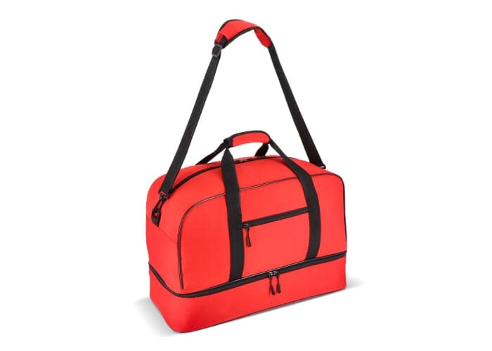 Reis- of sporttas met twee vakken, gemaakt van 600D gerecycled polyester. Voorzien van draaghandvatten, een afneembare en verstelbare schouderriem, een voorvak met ritssluiting en een bodemplaat voor stabiliteit. Twee vakken houden natte of vuile kleding en handdoeken gescheiden van andere spullen, of schoenen apart van kleding tijdens het reizen.