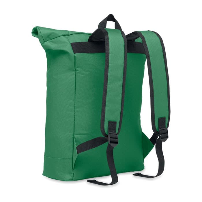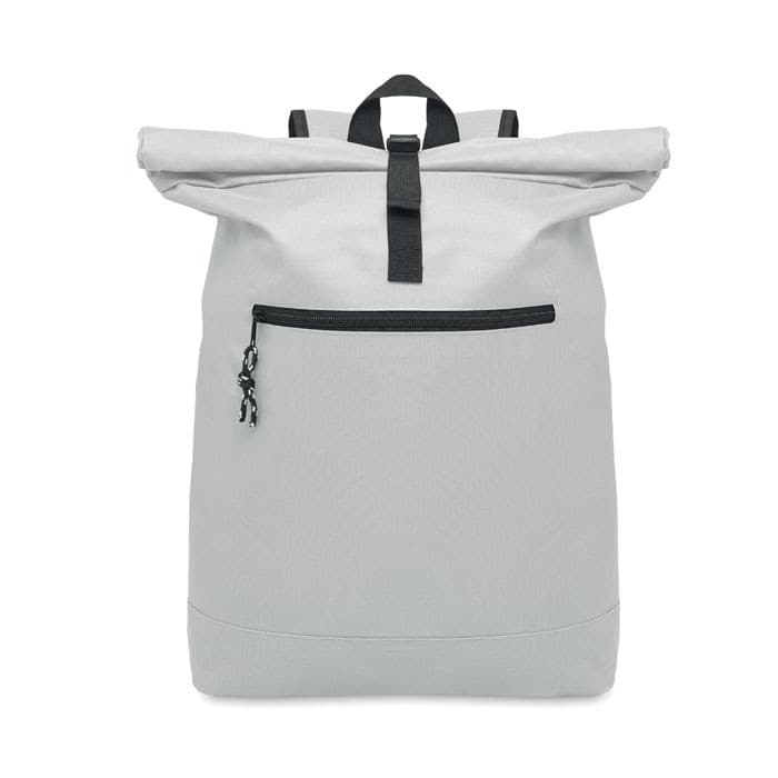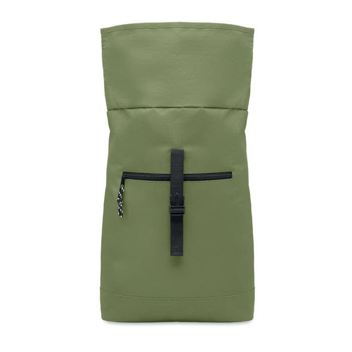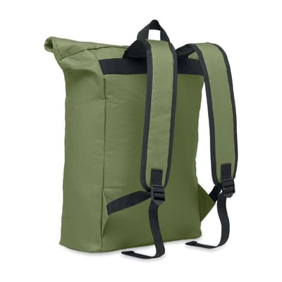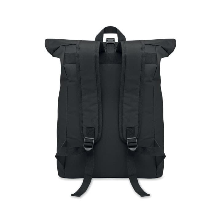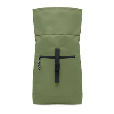 15 inch rolltop laptop rugzak van 600D polyester met gewatteerde achterkant en versterkte bodem. Afsluitbaar voorvak met rits. 210D voering.