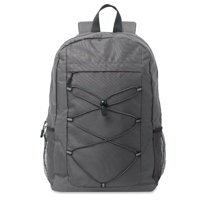 Rugzak van 600D RPET polyester met decoratief koord en ritsvak aan de voorkant. Meshzakken aan beide kanten.