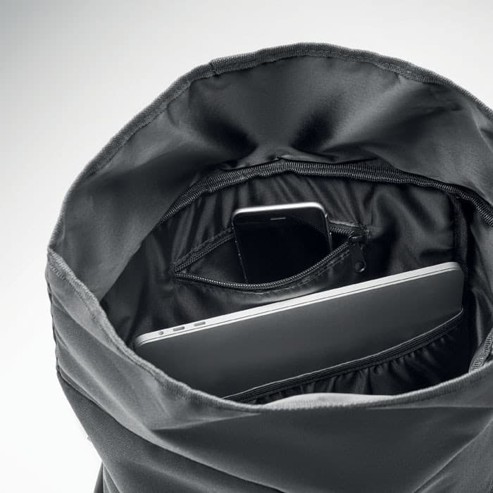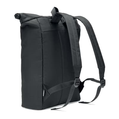 Rolltop rugzak van 600D RPET polyester met gewatteerde rug en bodemversterking. Zak aan voorzijde met rits. De voering is van 210D RPET.