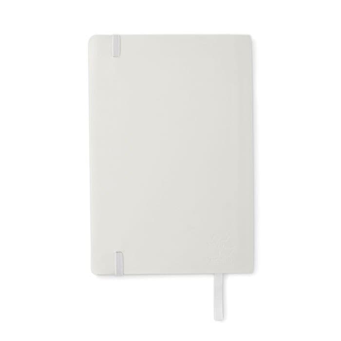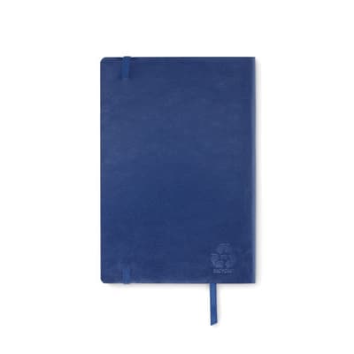 A5 notitieboek met zachte omslag van gerecycled PU. Ingebonden. 160 gelinieerde pagina's (80 vellen) recycle papier. Bijpassende elastische sluitingsband en lint als bladwijzer. Uitbreidbaar binnenvak achterin.