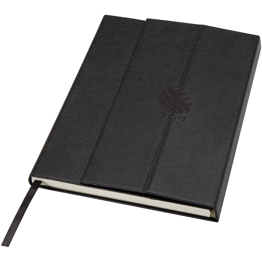 Het Alejandra A5 notitieboek met harde kaft is gemaakt van gerecycled PU-plastic en RPET, met 80 gelinieerde vellen crèmekleurig papier van 70 g/m² en heeft ook een lintmarkering en een accordeonvak.