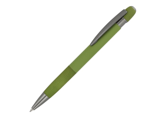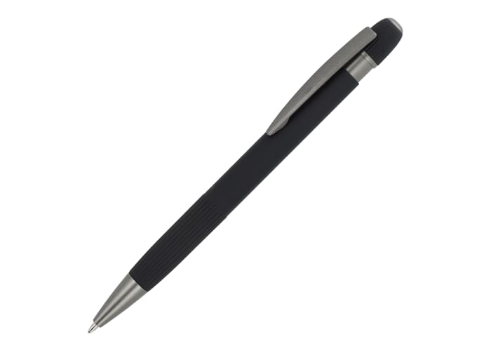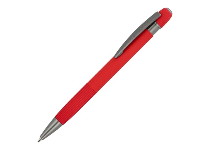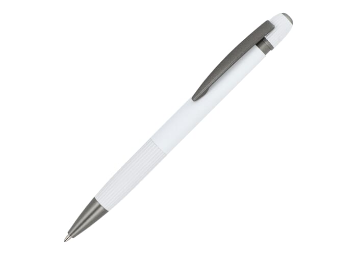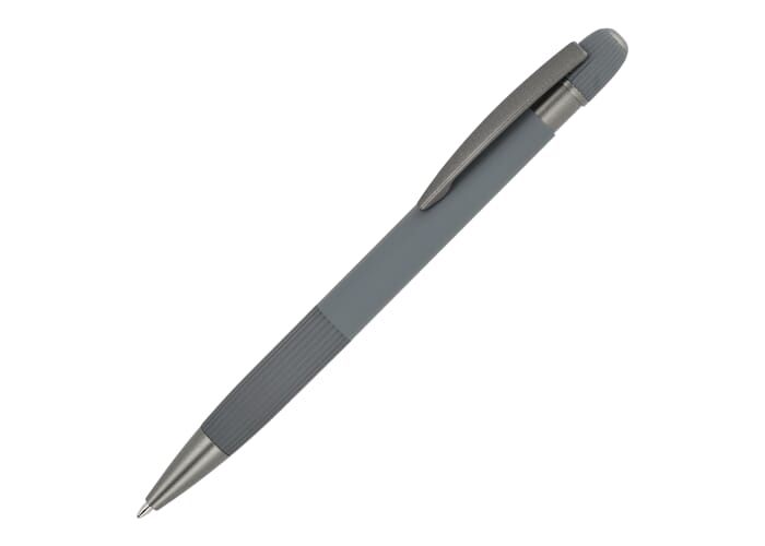 Stijlvolle aluminium balpen met metalen clip. Met populaire verticale strepen op de houder en de drukknop. Blauwschrijvende vulling.