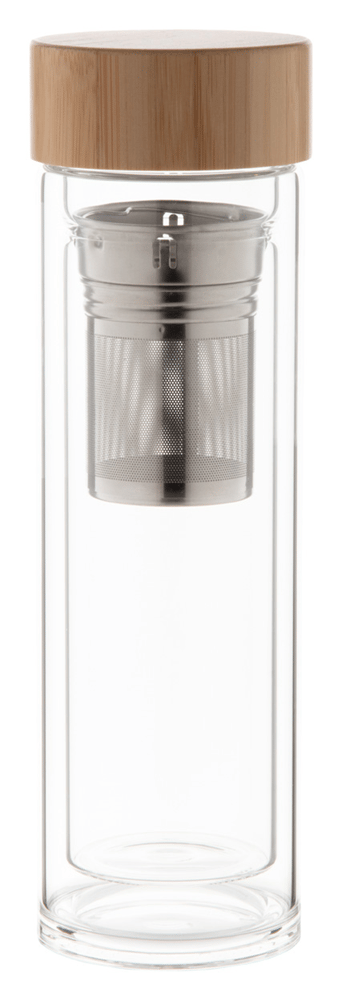 Dubbelwandige geïsoleerde fles van borosilicaatglas met thee-ei en bamboe deksel, 420 ml.