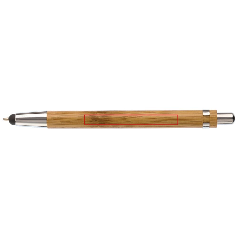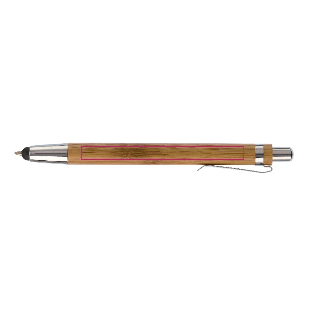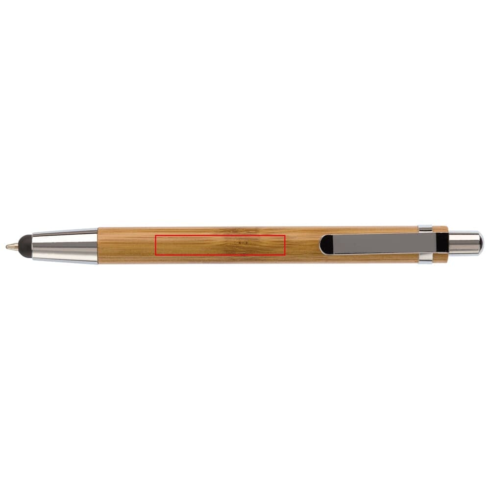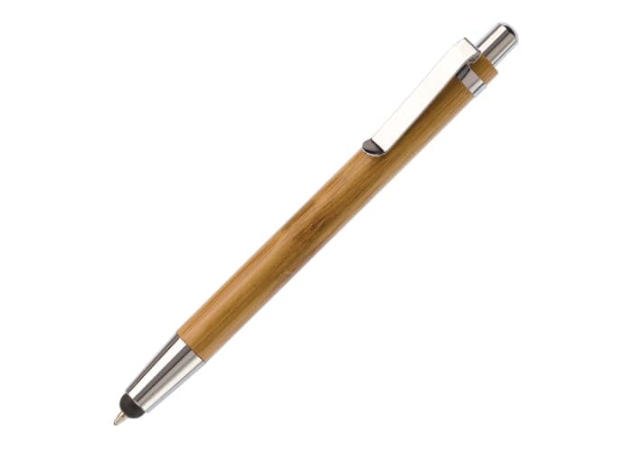 Balpen van bamboe materiaal met gemetaliseerde drukker en punt en metalen clip. De pen bevat een stylus om een touchscreen te bedienen. Inclusief zwartschrijvende Jumbo vulling.