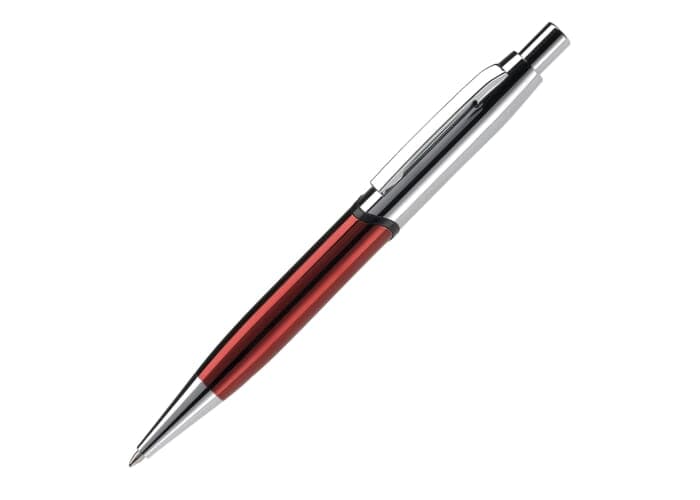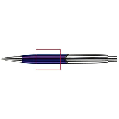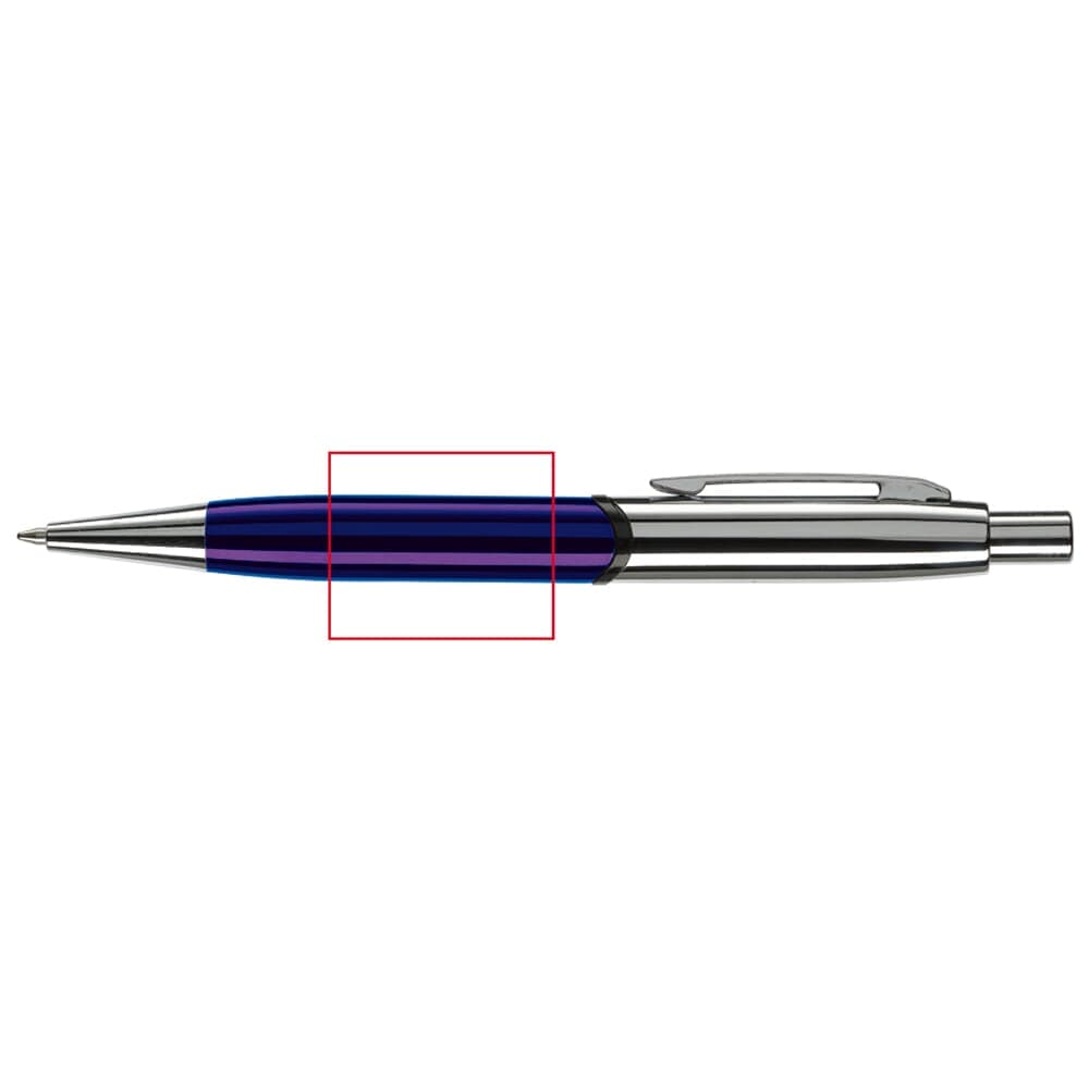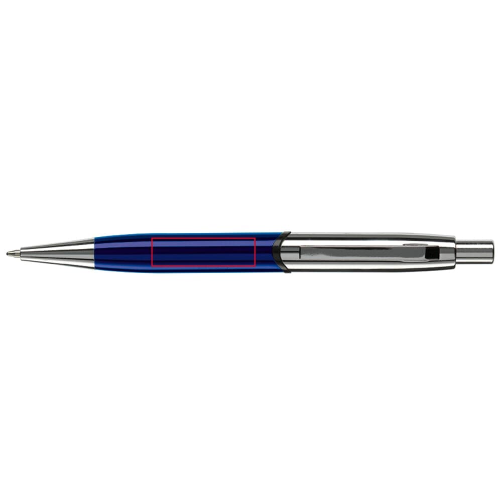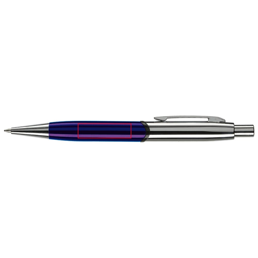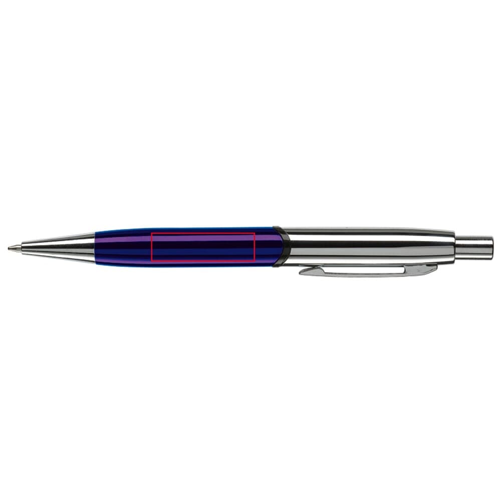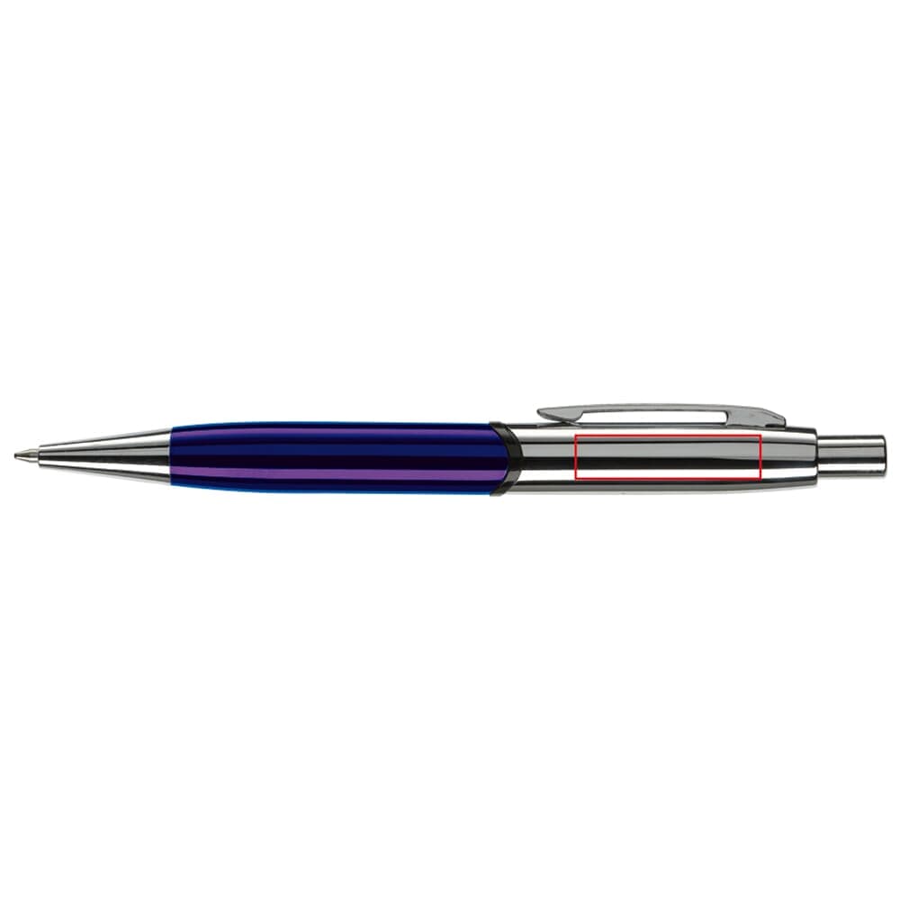 Robuuste metalen balpen. Hoogglans met verchroomde delen. De pen bevat een blauwschrijvende metalen Jumbo vulling. Lasergravering (zilver) mogelijk.