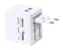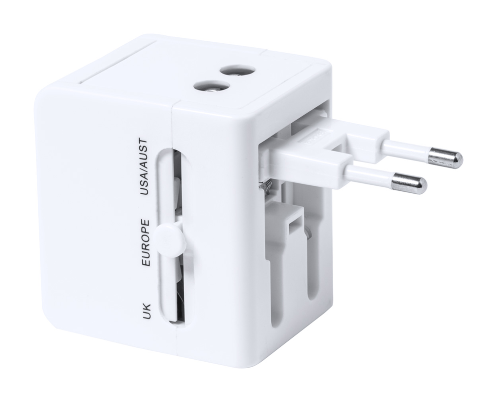 Universele wereldwijde reisstekker/ adapter van ABS-kunststof. Met 1 USB- en 1 USB-C-oplaadpoorten. Max. uitgang: 3100mA. In fluwelen draagtasje.