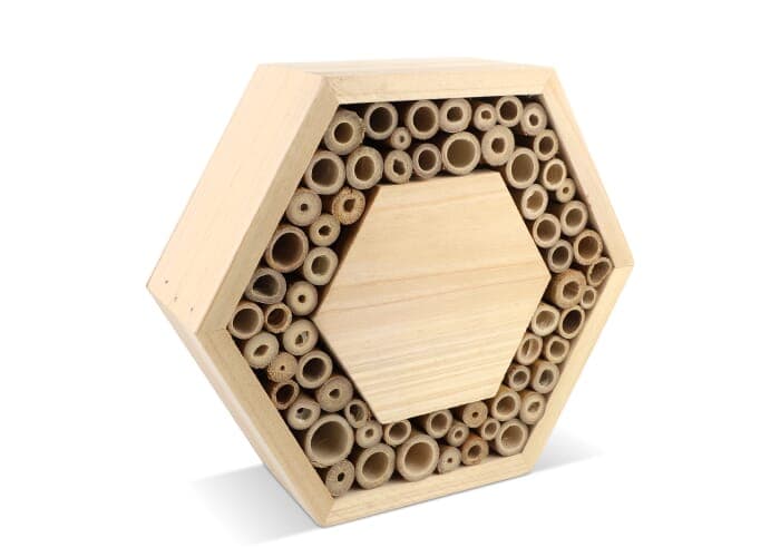 Zeshoekig bijenhuisje gemaakt van FSC-hout met groot centraal drukoppervlak. Geschikt voor solitaire bijen zoals metselbijen en bladbijen. Deze onschadelijke bijen zijn essentiële bestuivers die de biodiversiteit in tuinen en groene ruimtes ondersteunen. Een duurzaam en educatief relatiegeschenk.