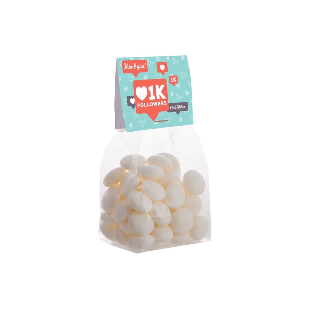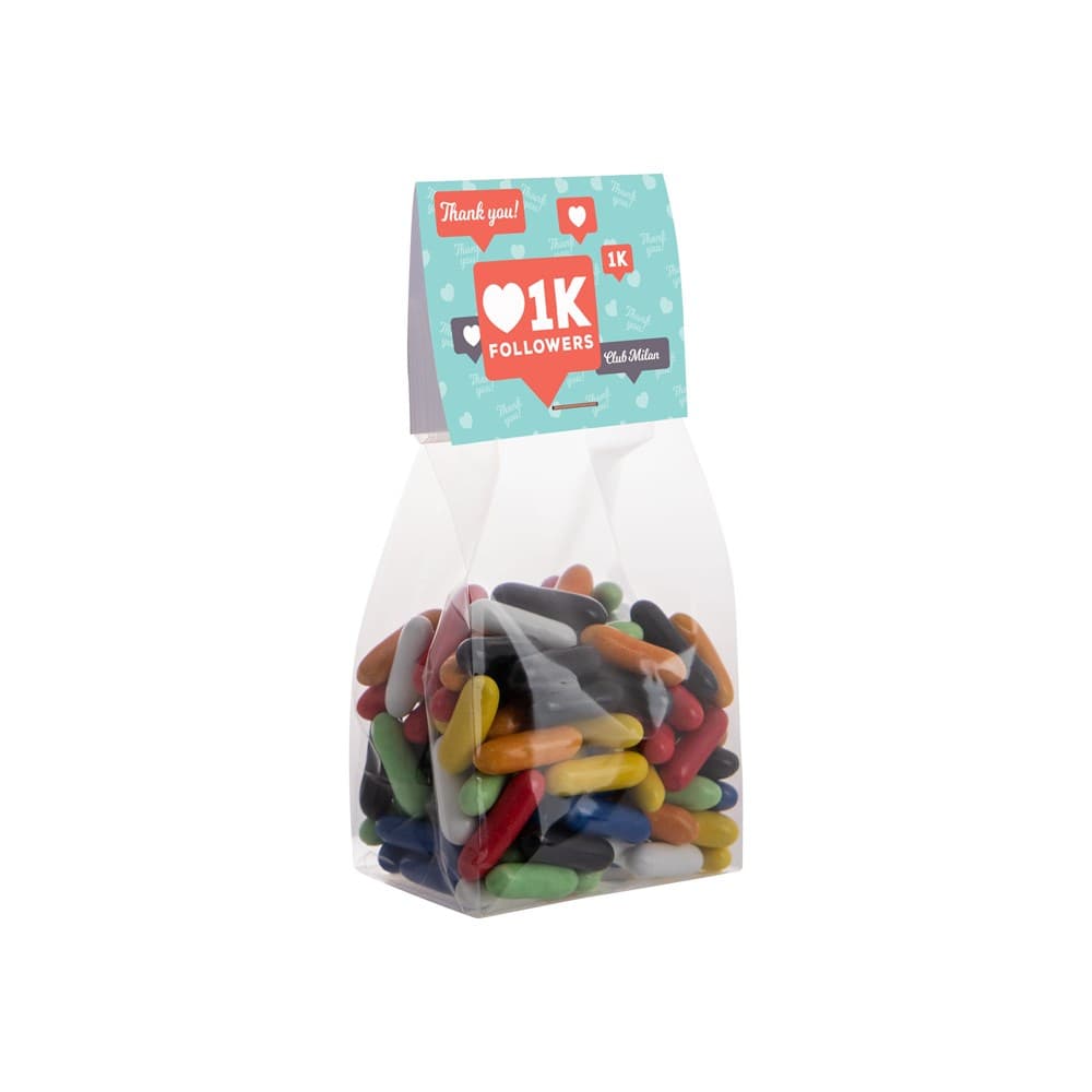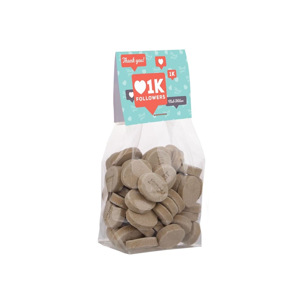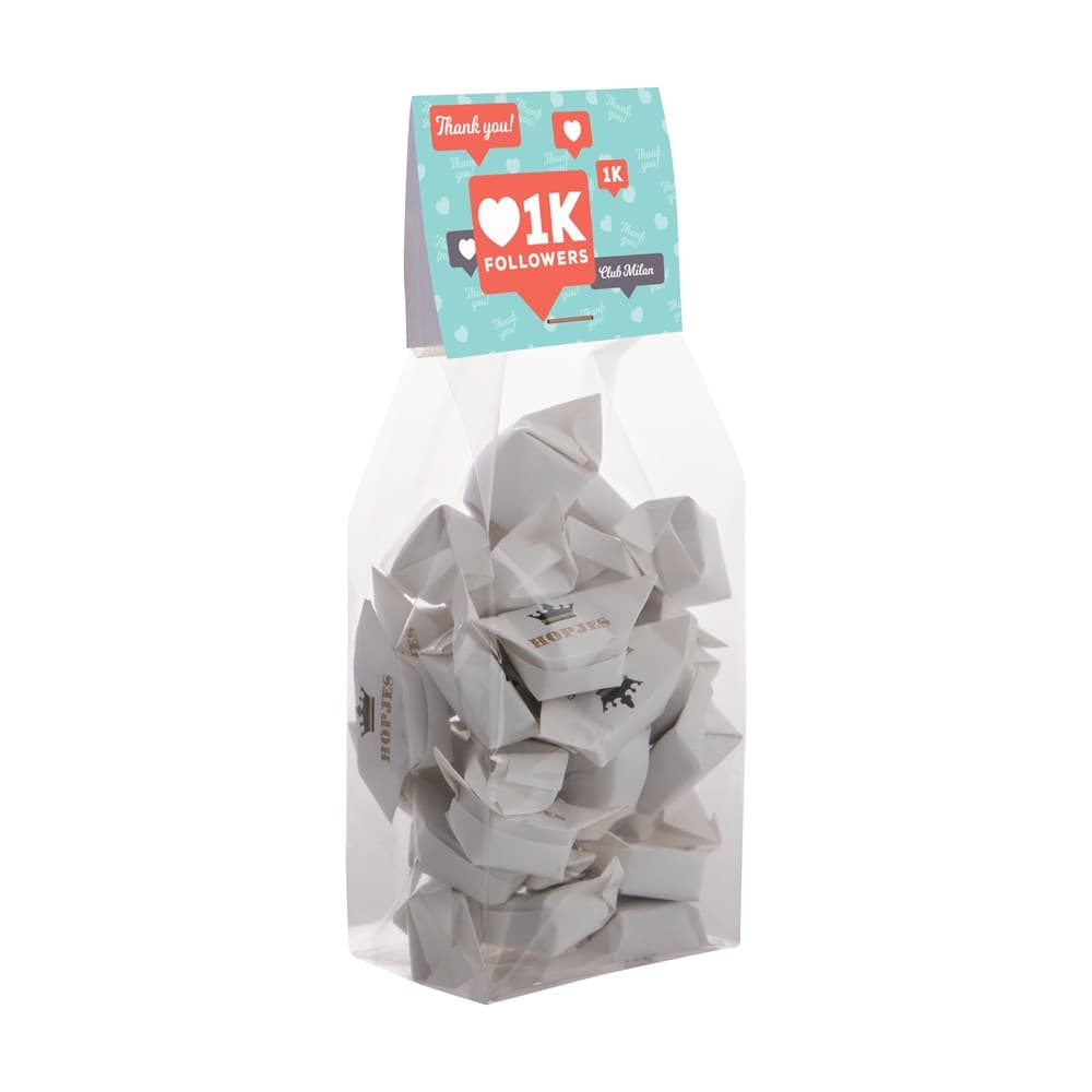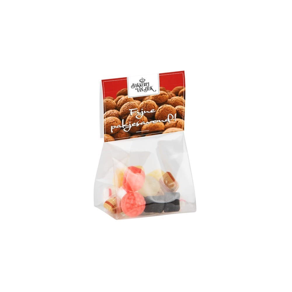 Transparant blokzakje met full colour bedrukt kopkaartje, gevuld met 150 gram imperiales