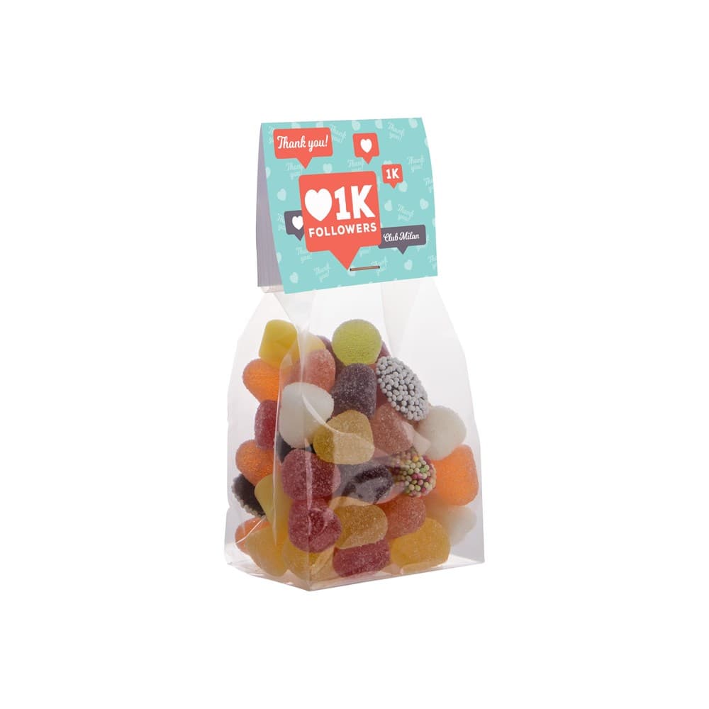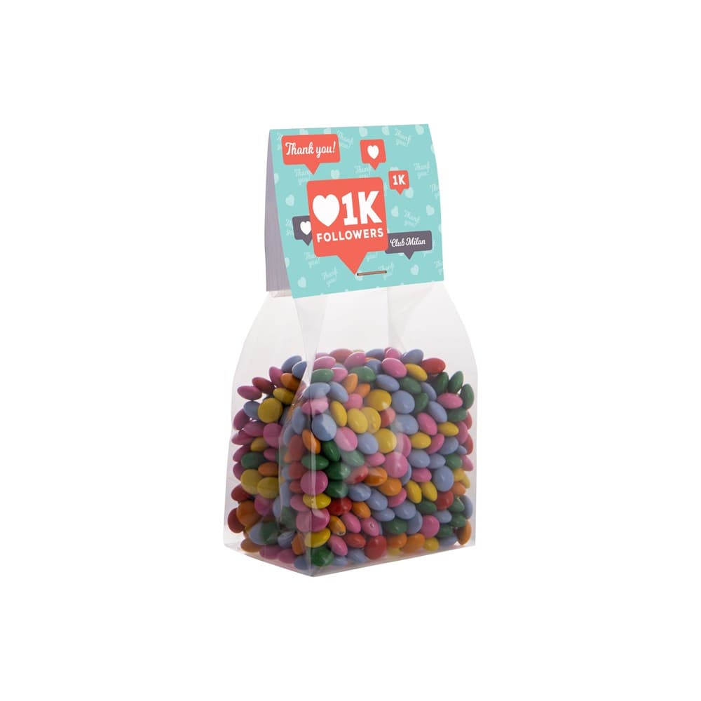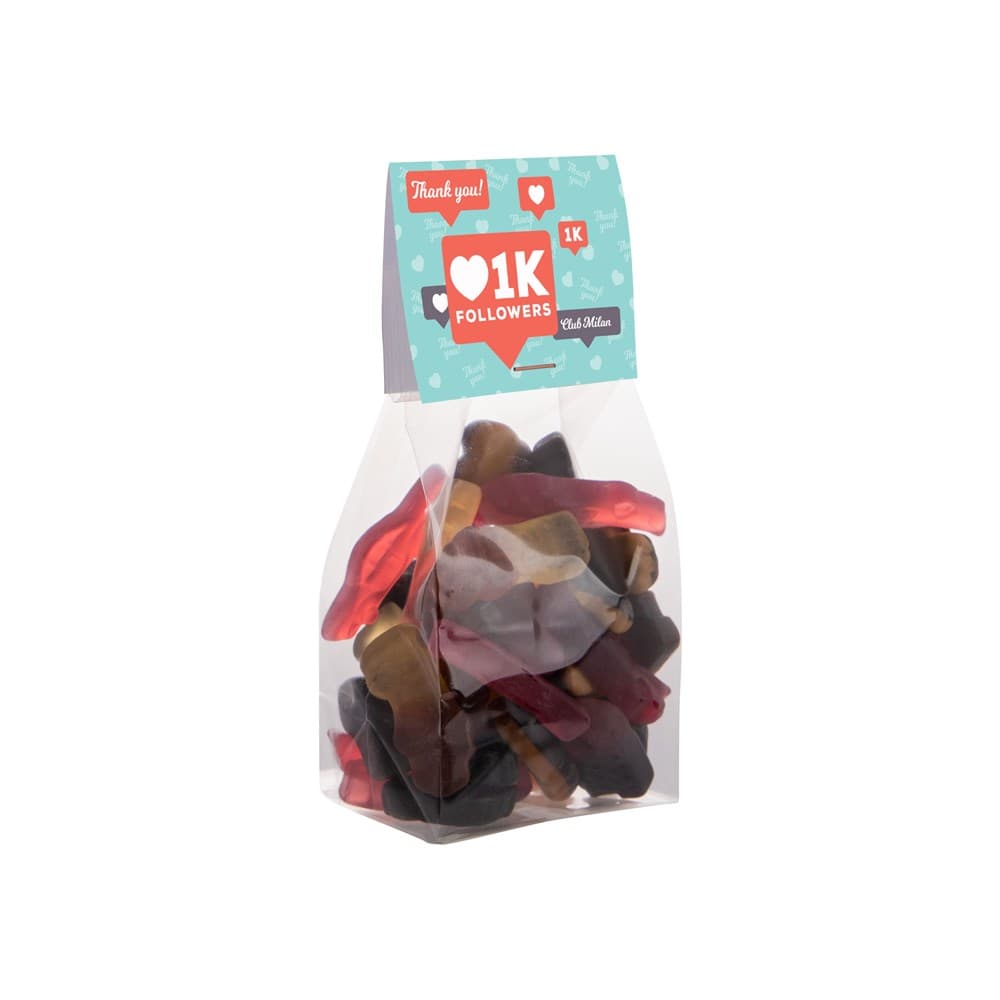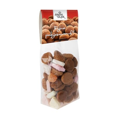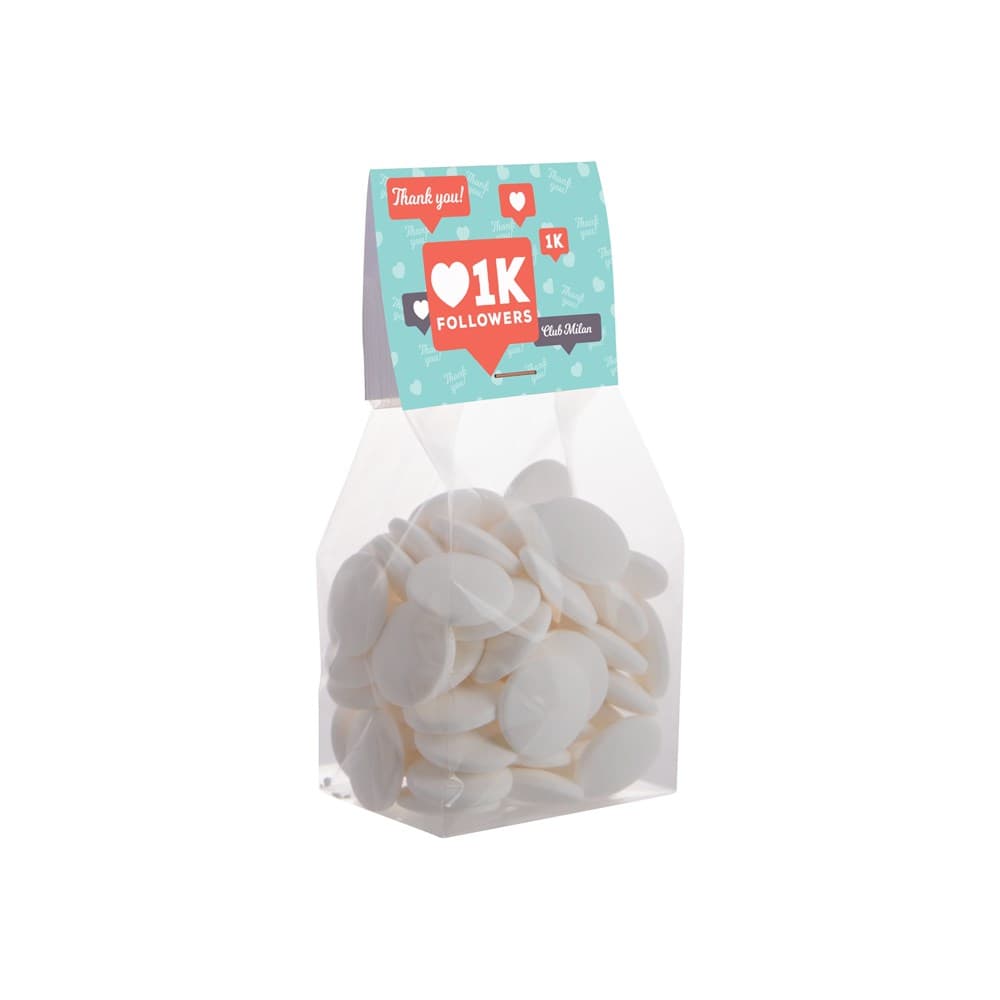 Transparant blokzakje met full colour bedrukt kopkaartje, gevuld met 150 gram imperiales