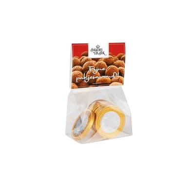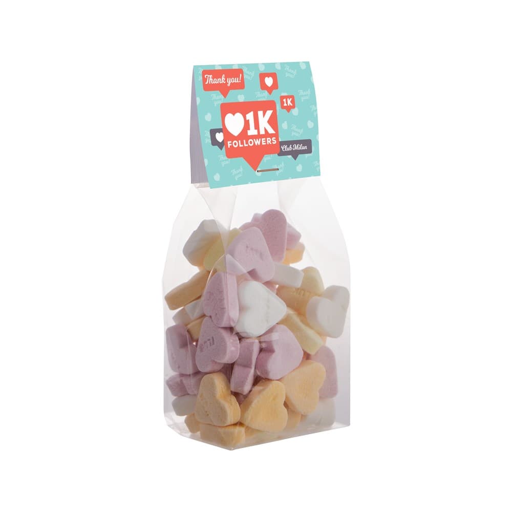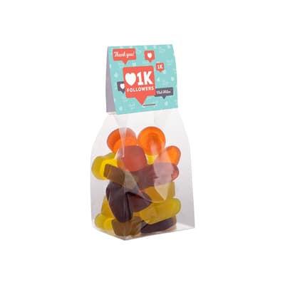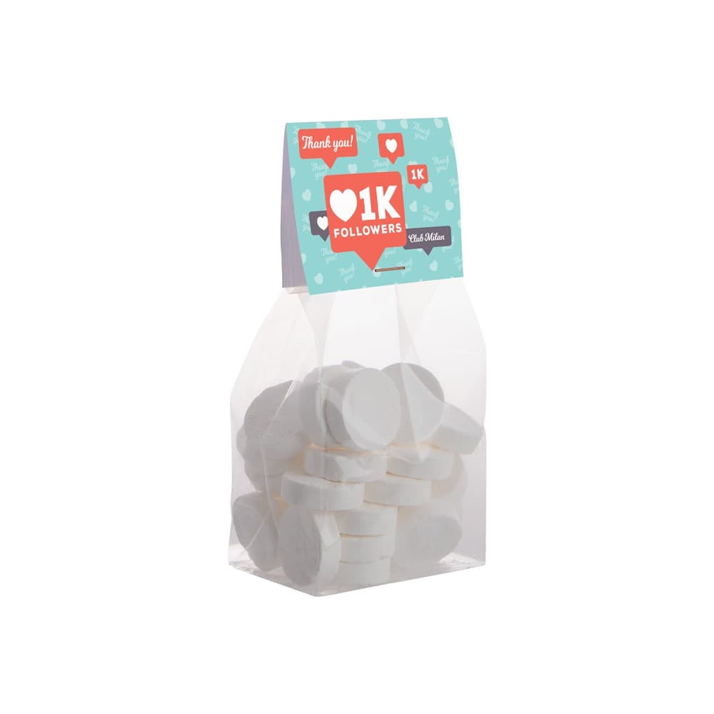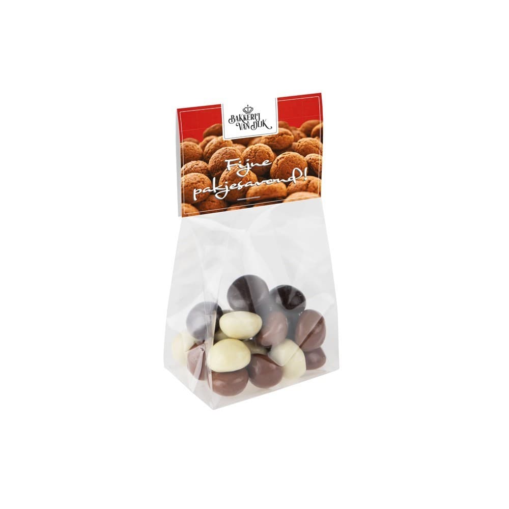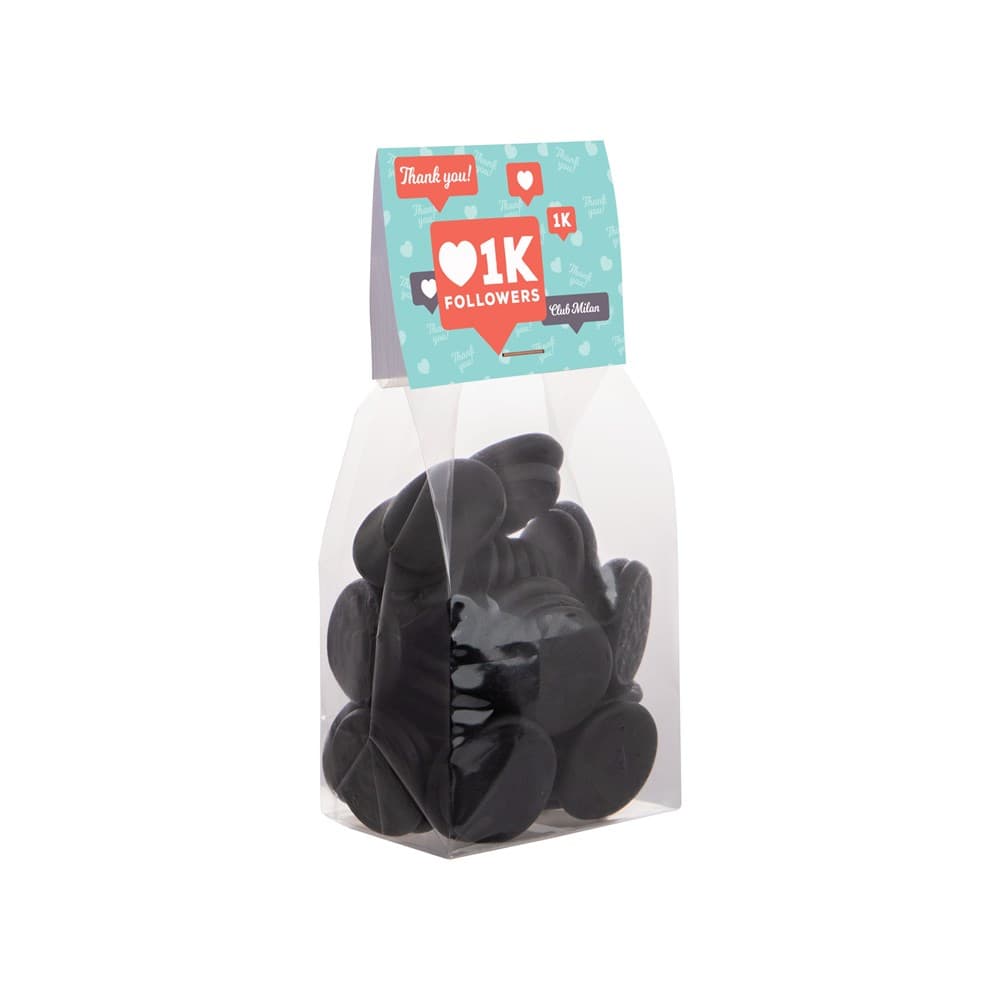 Transparant blokzakje met full colour bedrukt kopkaartje, gevuld met 150 gram imperiales