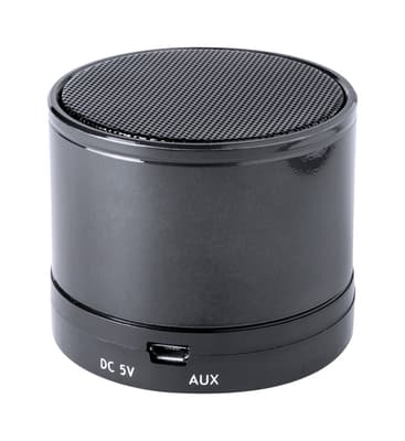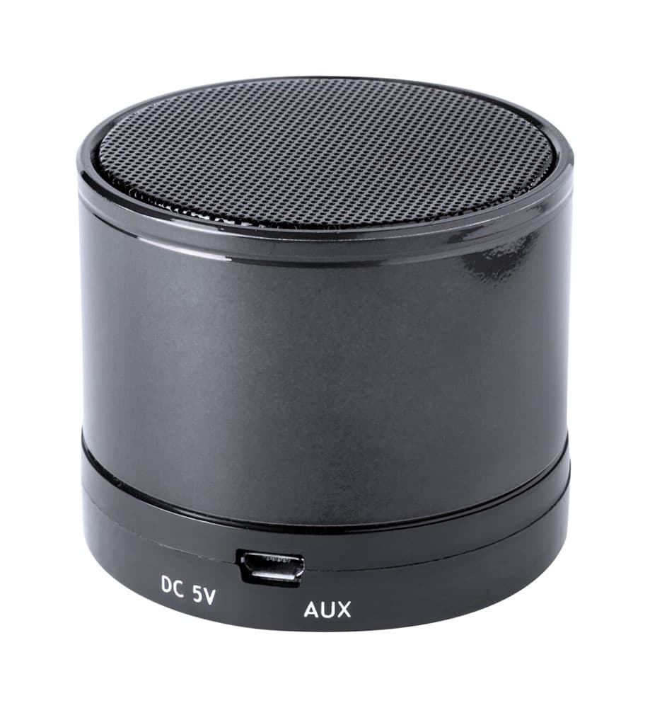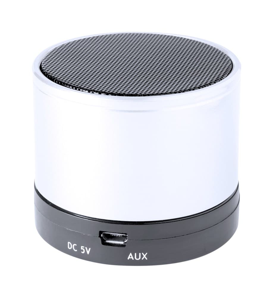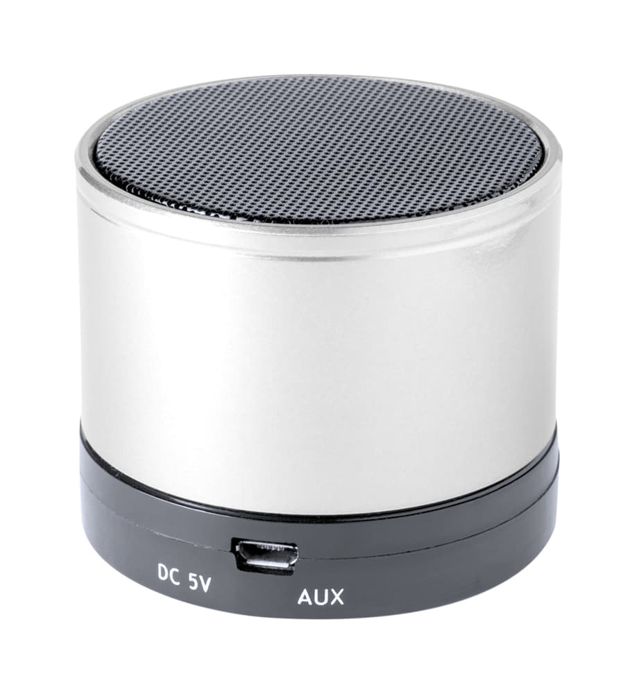 Een Bluetooth speaker gadget met metalen behuizing, voorzien van radio, mp3-speler en handsfree belfunctie in een ingebouwde oplaadbare accu. Inclusief USB-lader en aux-in kabel.