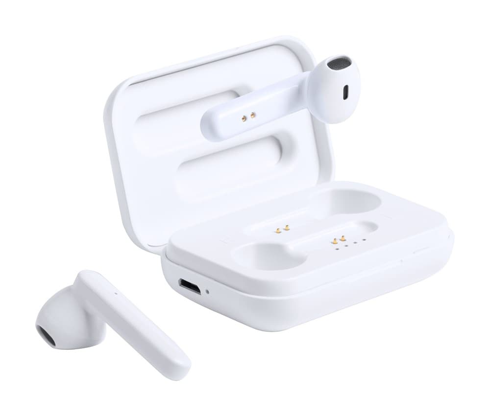 Draadloze Bluetooth-oortelefoon met handsfree-oproepfunctie in plastic oplader. Inclusief USB-laadkabel.
