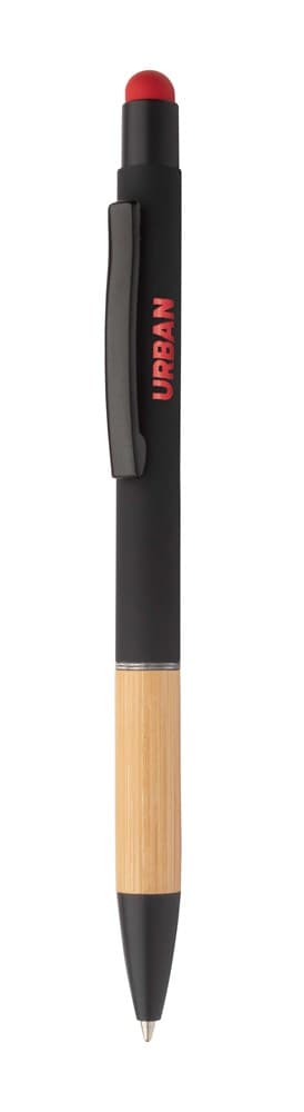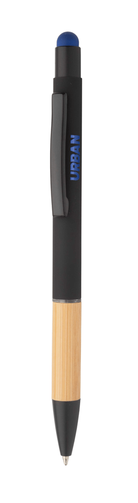 Aluminium balpen en touch screen pen met bamboe grip en rubberen afwerking. Met speciale coating voor spiegelgravure passend bij de kleur van de touchscreen tip. Blauwschrijvend.