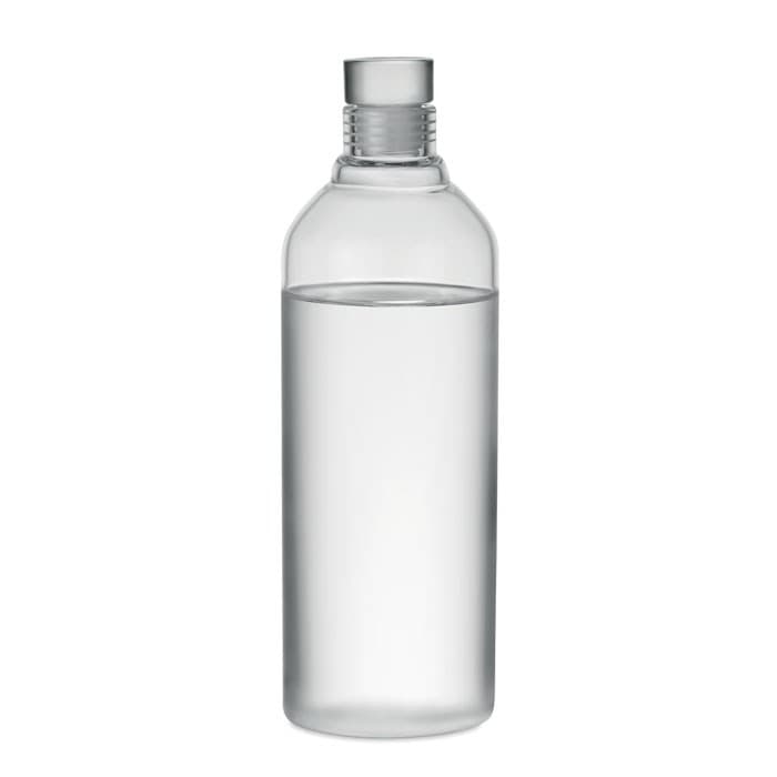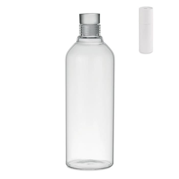 Grote fles van borosilicaatglas met lekvrije glazen dop. Verpakt in een kartonnen koker. Inhoud: 1 L.