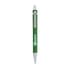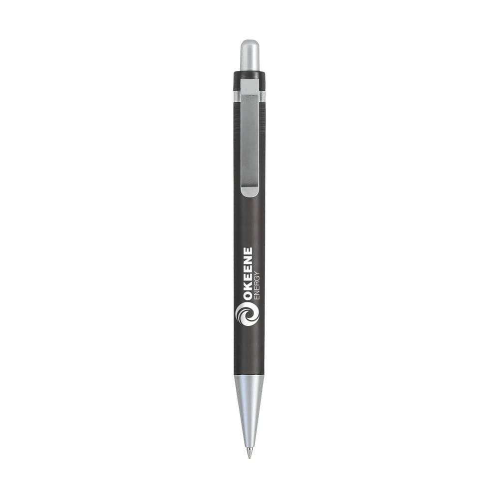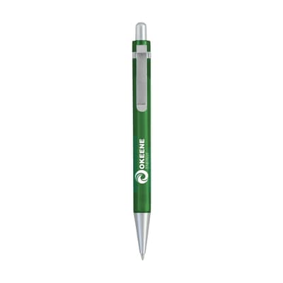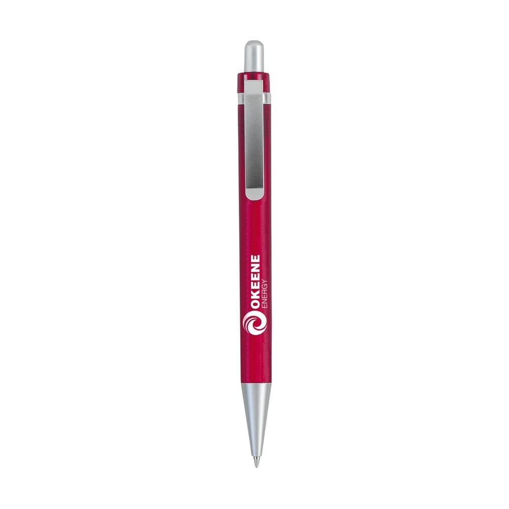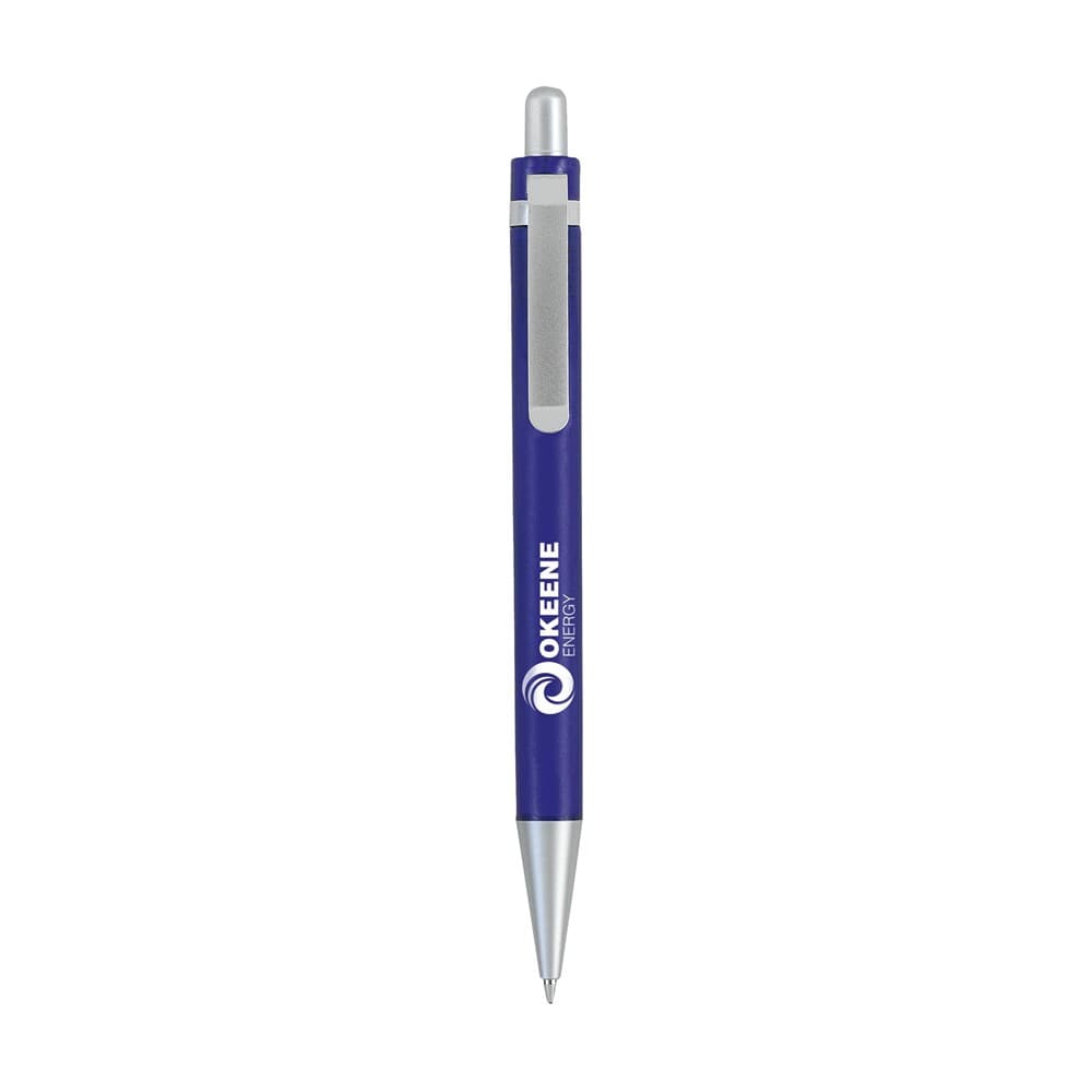 Blauwschrijvende balpen met transparantgekleurde houder en matmetalen clip.